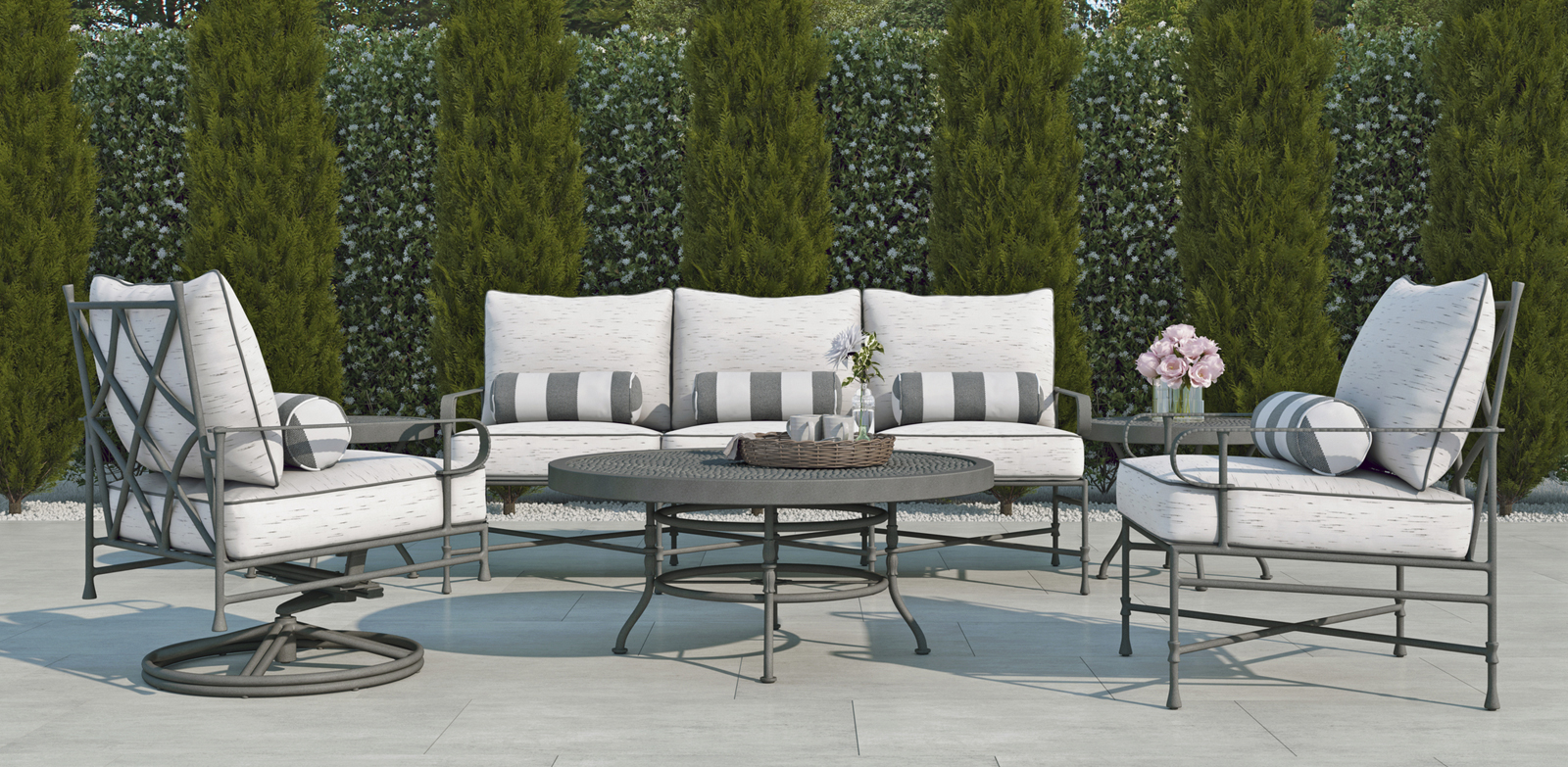 The beauty and elegance of a French garden design are found in the CASTELLE BORDEAUX collection.  The appeal of handcrafted aluminum is on display in the design style of this formal style open cast back design.