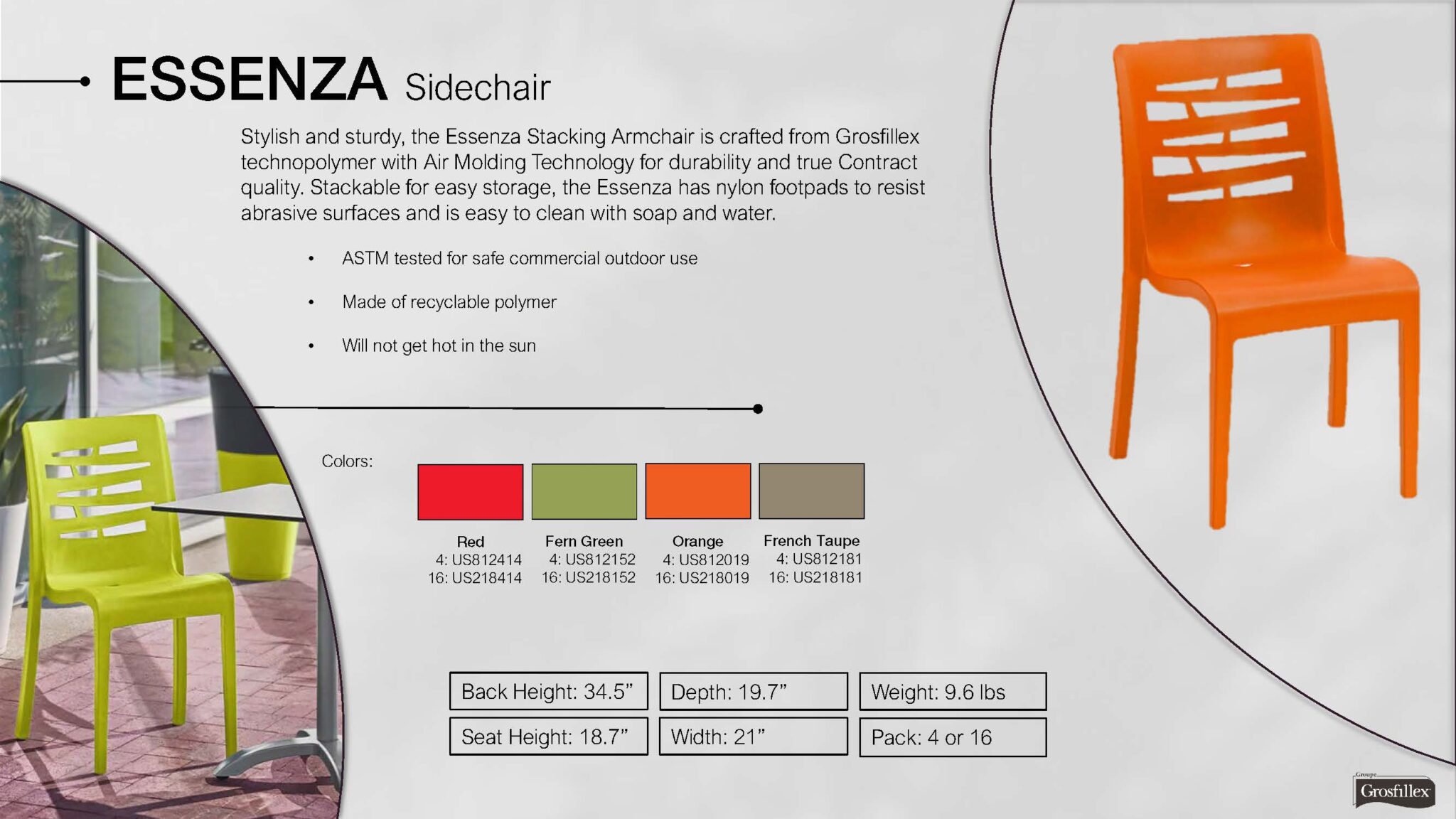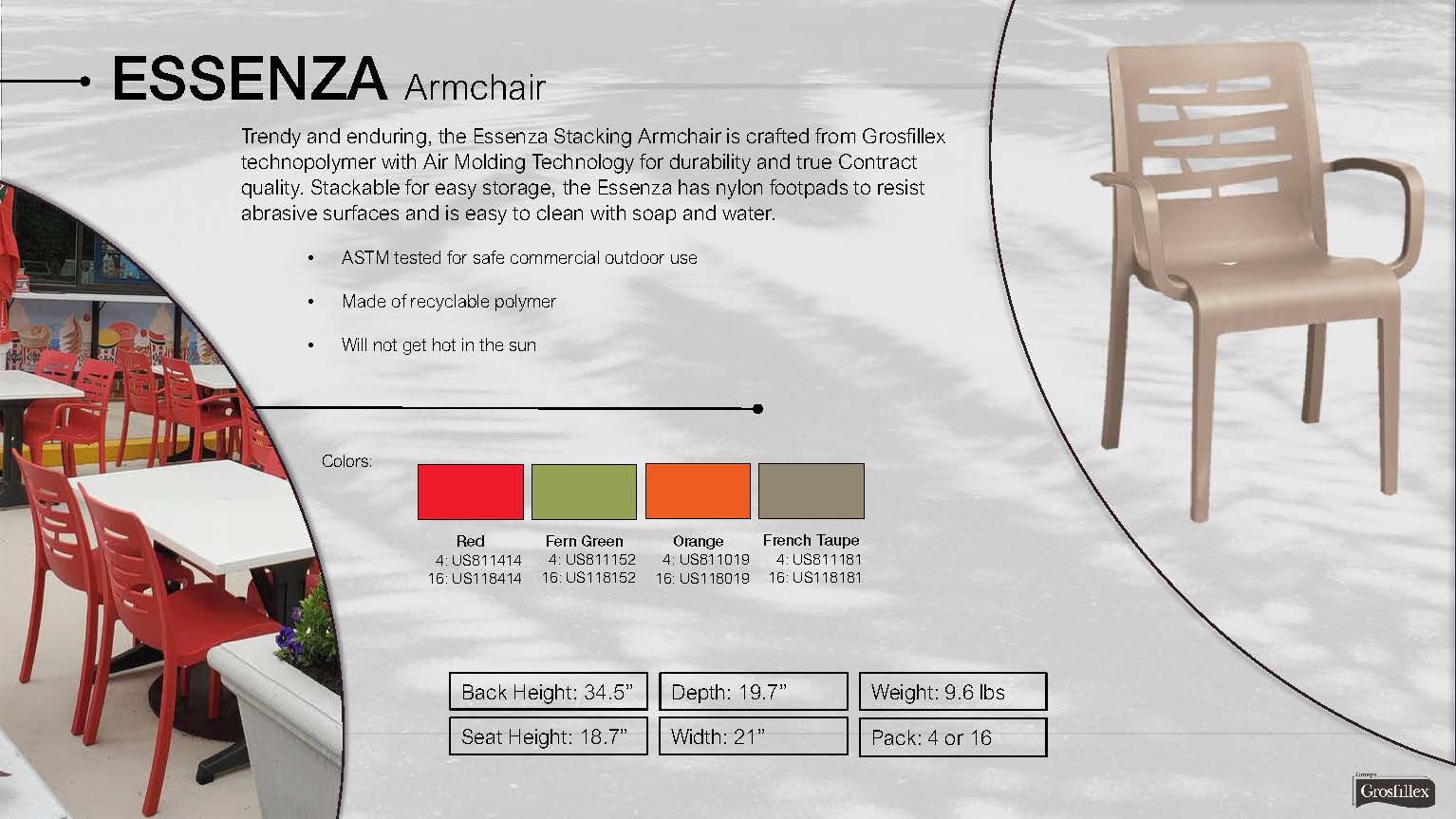 Stylish and sturdy, the Essenza Stacking Armchair is crafted from Grosfillex technopolymer with Air Molding Technology for durability and true Contract quality. Stackable for easy storage, the Essenza has nylon footpads to resist abrasive surfaces and is easy to clean with soap and water.