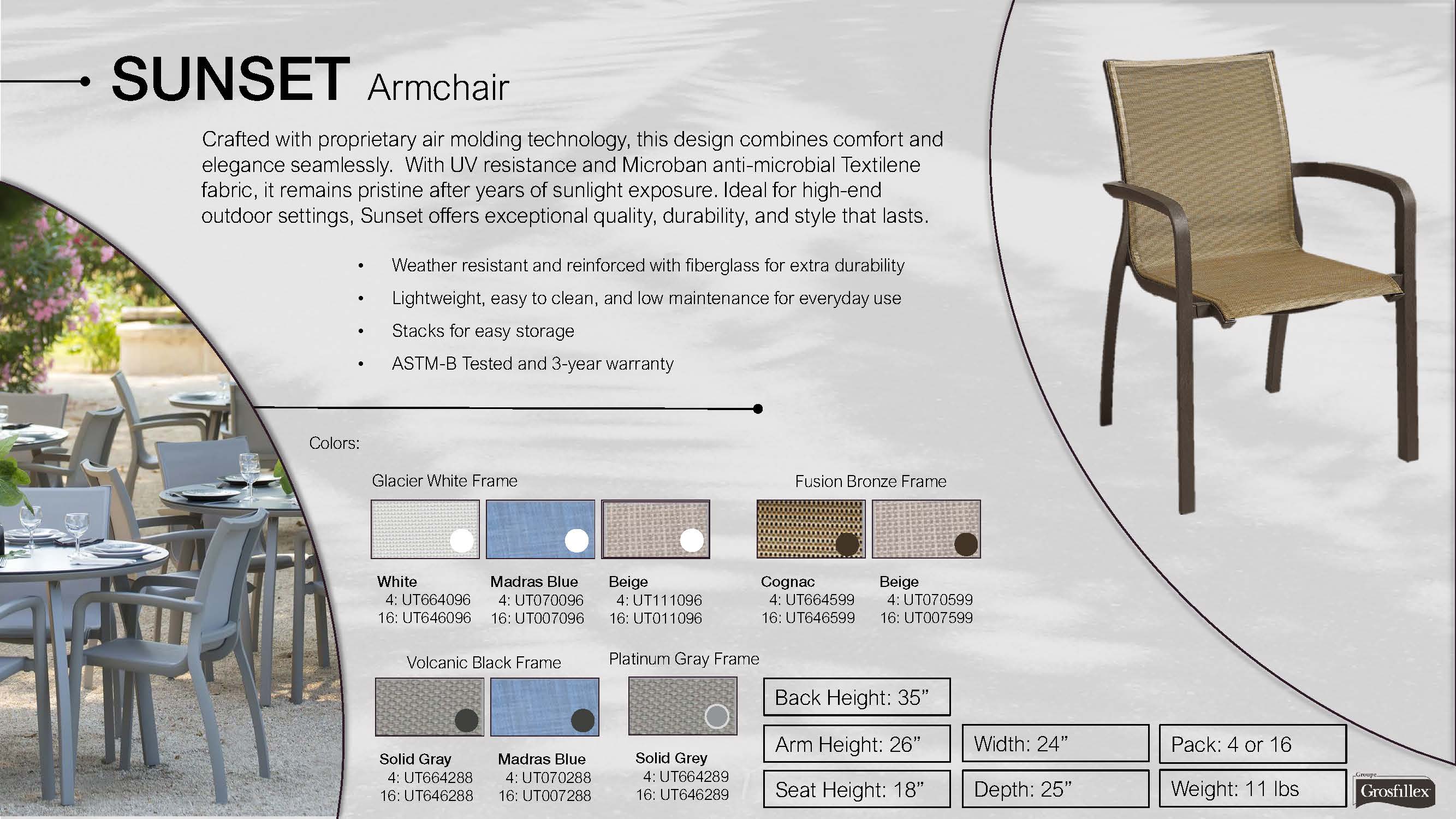 Crafted with proprietary air molding technology, this design combines comfort and elegance seamlessly. With UV resistance and Microban anti-microbial Textilene fabric, it remains pristine after years of sunlight exposure. Ideal for high-end outdoor settings, Sunset offers exceptional quality, durability, and style that lasts.