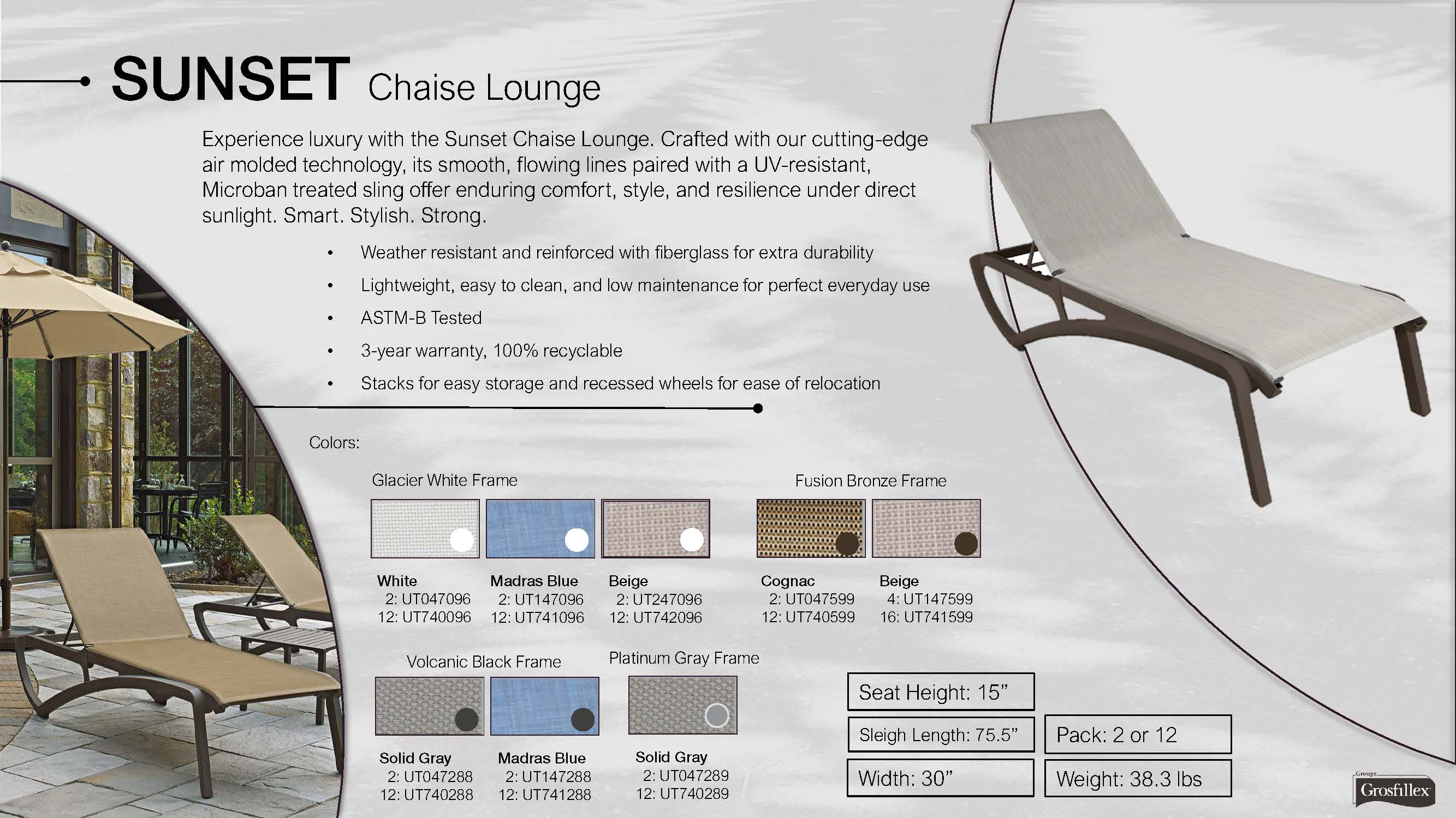 Experience luxury with the Sunset Chaise Lounge. Crafted with our cutting-edge air molded technology, its smooth, flowing lines paired with a UV-resistant, Microban treated sling offer enduring comfort, style, and resilience under direct sunlight. Smart. Stylish. Strong.