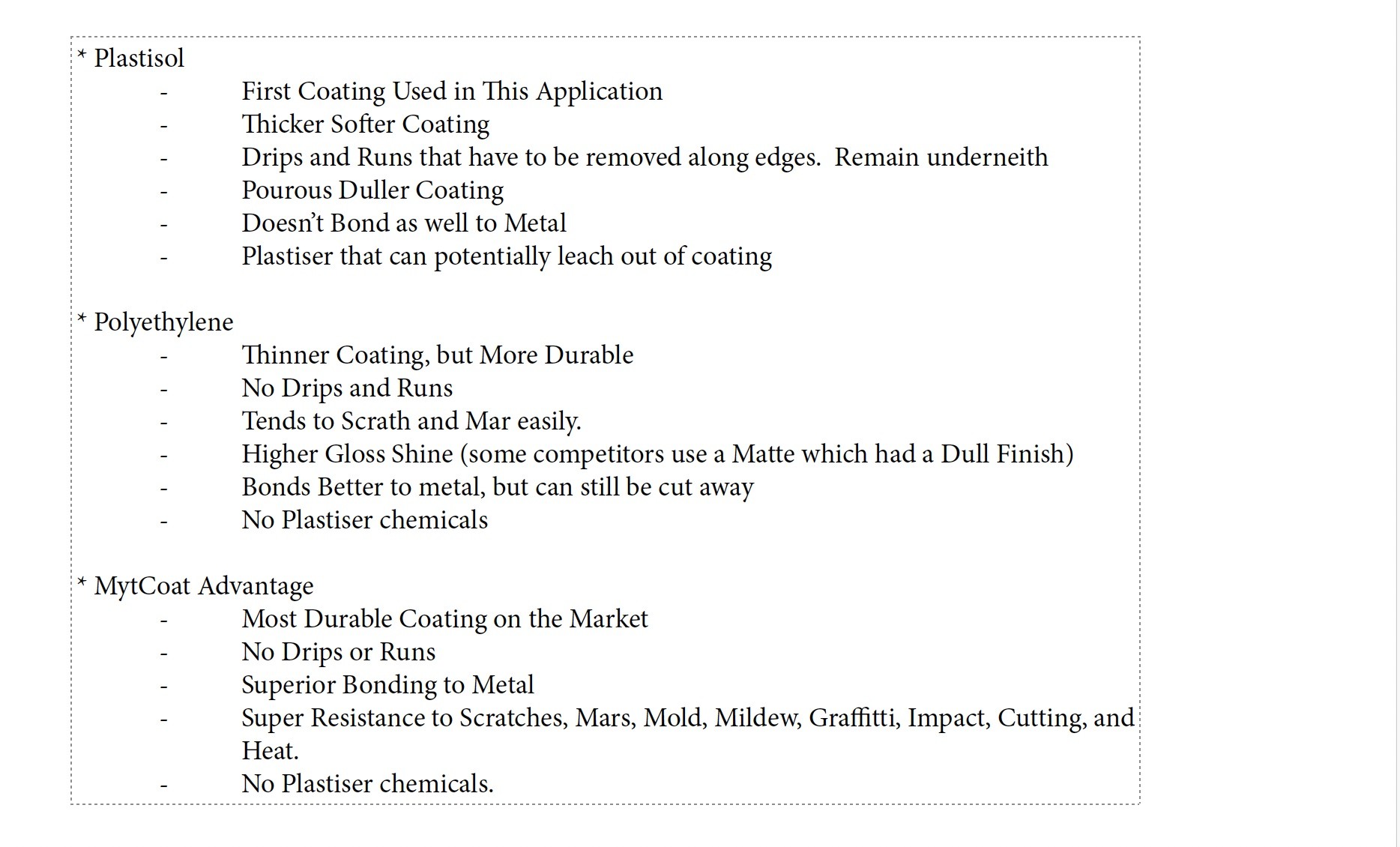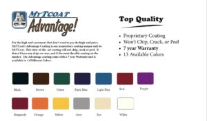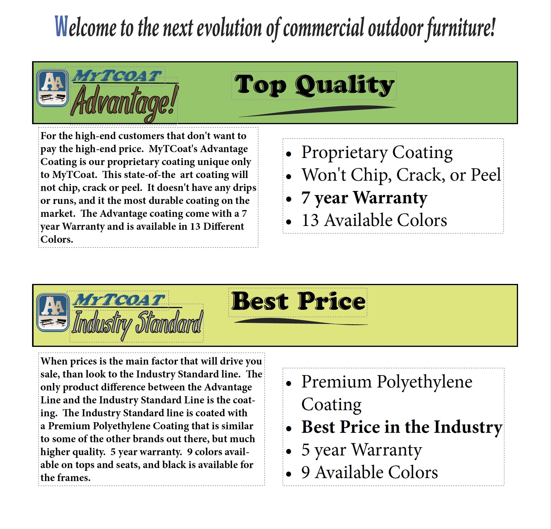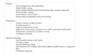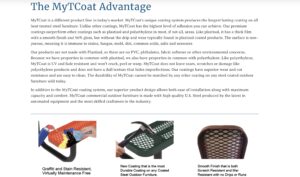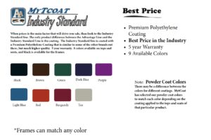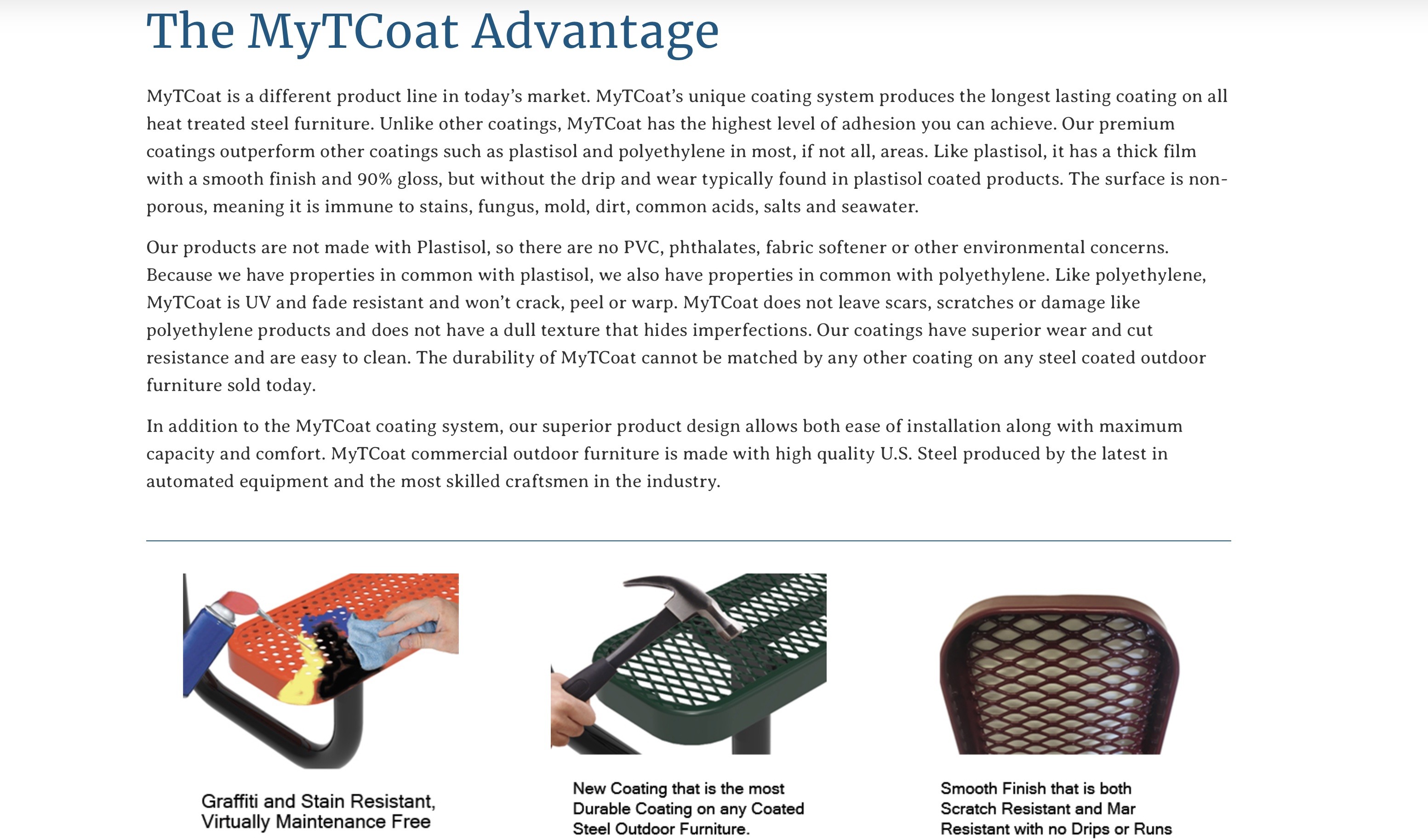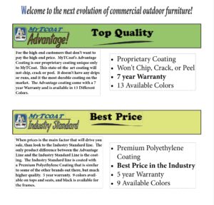 MyTCoat is a different product line in today’s market. MyTCoat’s unique coating system produces the longest lasting coating on all heat treated steel furniture. Unlike other coatings, MyTCoat has the highest level of adhesion you can achieve. Our premium coatings outperform other coatings such as plastisol and polyethylene in most, if not all, areas.